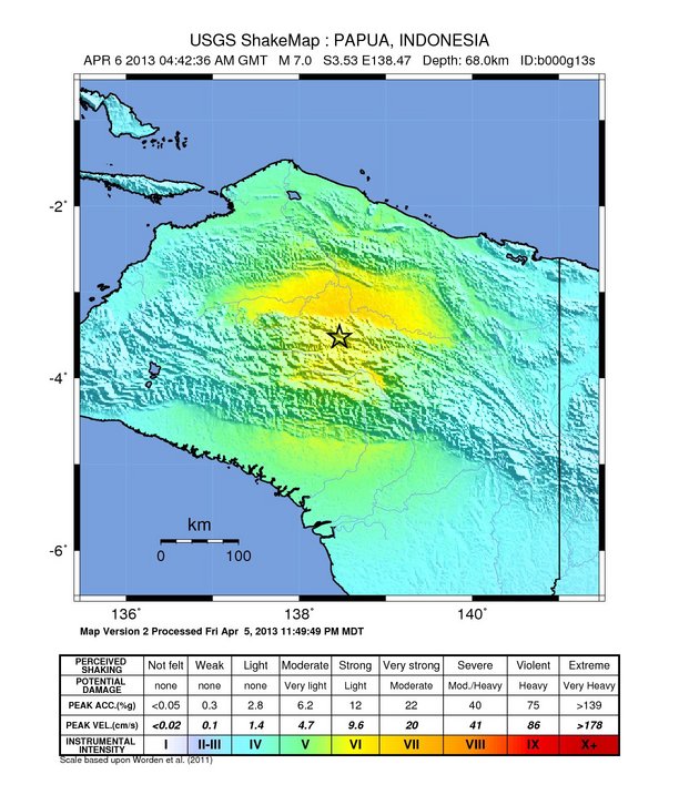 Im Indonesischen Teil der Insel Neuguinea kam es um 6.42 Uhr MESZ zu einem schweren Erdbeben der Stärke 7,2. Nach angaben des USGS ereignete es sich in einer Tiefe von 75 Kilometern. In der nördlichen Tiefebene der Insel ergibt sich somit Intensität VII. Dort leben nach Schätzungen des USGS etwa 9000 Menschen in größeren Dörfern oder Städten. In der Bergregion war das Erdbeben weniger intensiv. Auch wenn Indonesien an schwere Erdbeben gewöhnt ist, muss hier mit schweren Schäden gerechnet werden. Eine Tsunami-Warnung gibt es nicht. Updates folgen.